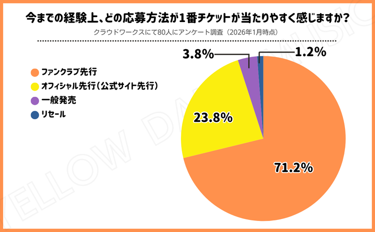 当ブログで行った独自アンケートによると、「今までの経験上、どの応募方法が1番チケットが当たりやすく感じますか?」という質問で1番多かったのは「ファンクラブ先行」で71.2%した。