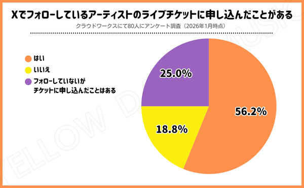 チケット申し込み人数を予測するために、当ブログでアンケート調査を実施したところ、Xでフォローしているアーティストのライブチケットに申し込む人の割合は56%